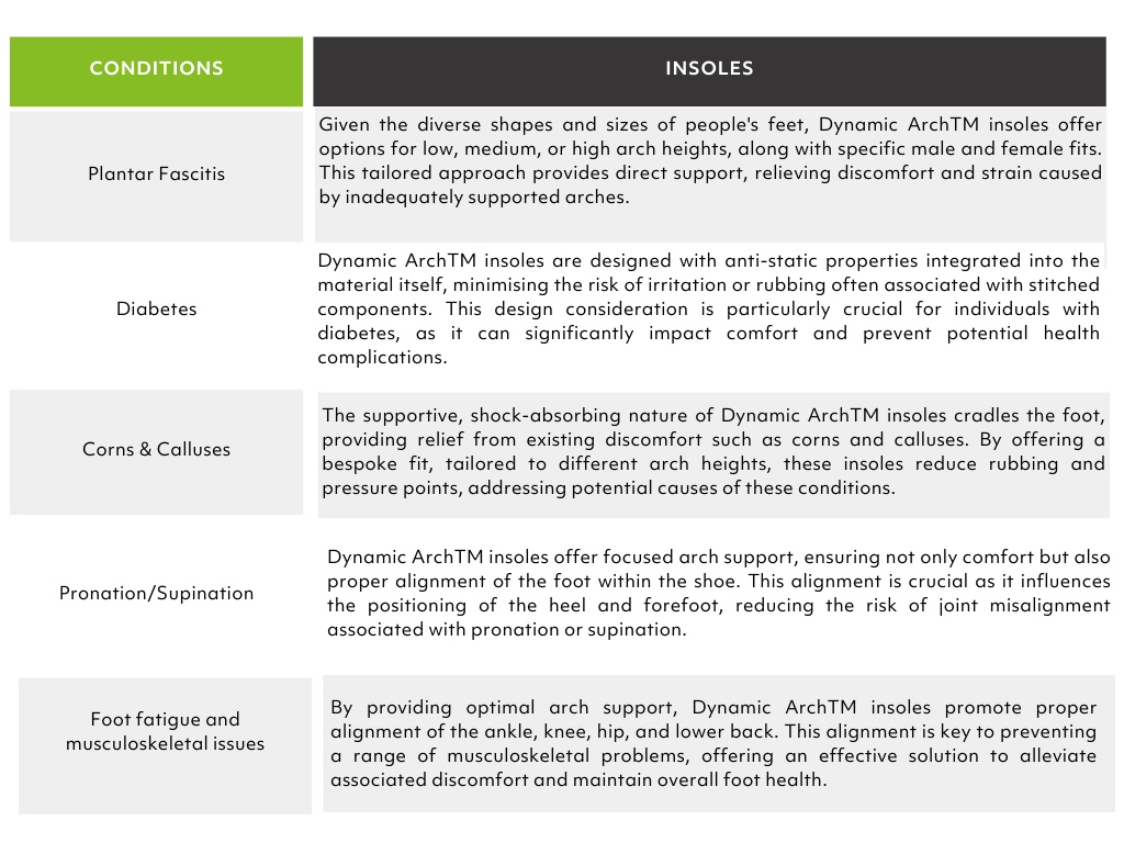 Working with a leading supplier, V12 – we offer our customers Dynamic ArchTM insoles, crafted through collaboration with motion analysts and podiatrists, tailored to address the various foot concerns outlined earlier. Let's delve into how they work: