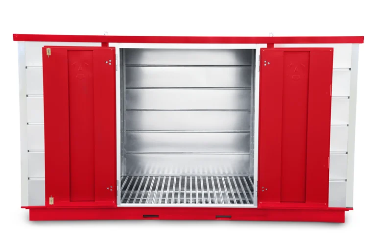 The spacious interior provides ample room for storage suitable for 205-litre drums and other smaller containers, with a 960L sump capacity should spillages occur. The modular design allows for easy assembly and transportation, catering to both temporary and permanent storage needs with equal efficiency. The double doors also make it easy to access if bigger items require storage.