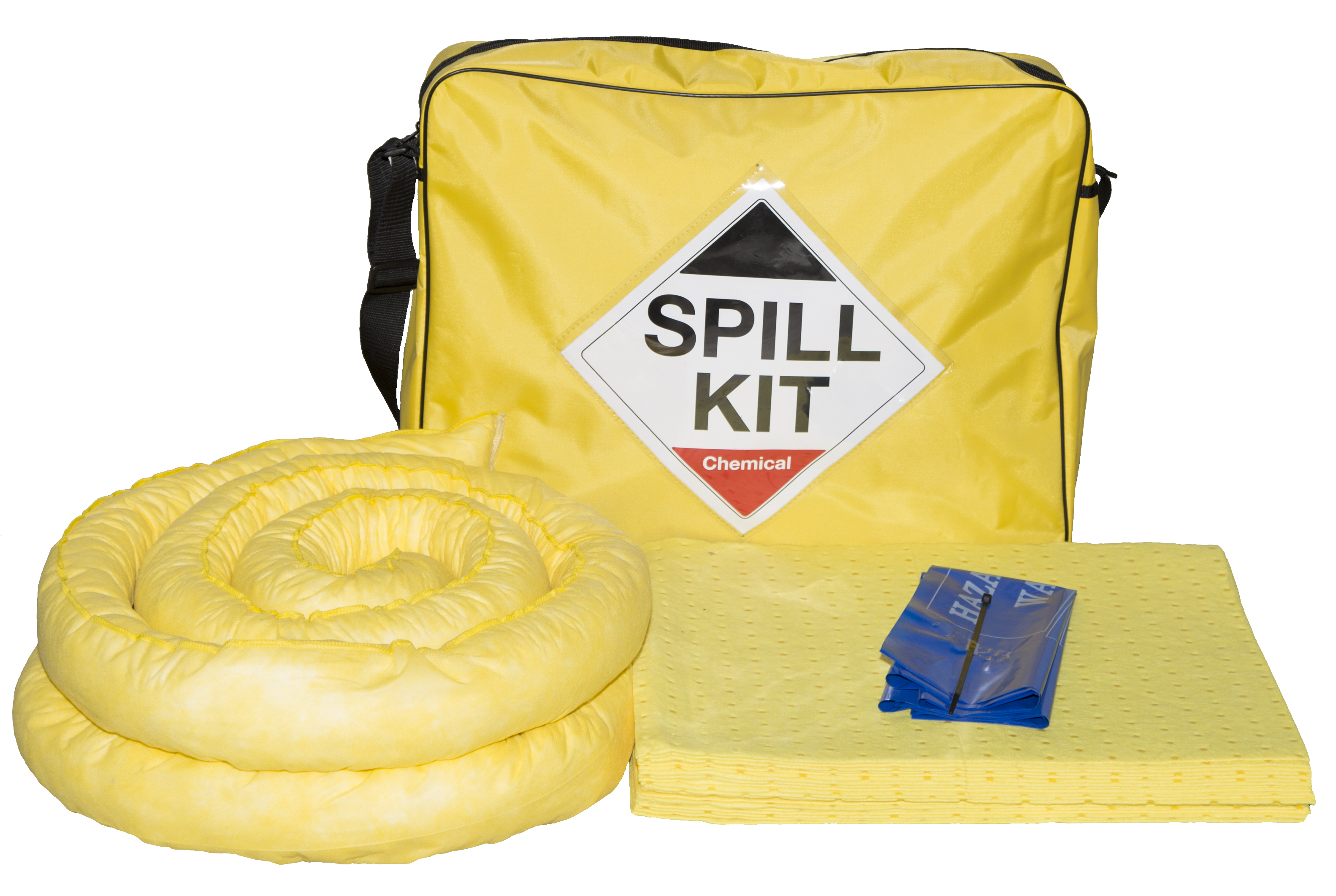 50 litre Spill Kit in a Hi-Vis shoulder bag. For use on leaks and spills in the workplace for quick and efficient clean-up. The kit includes absorbent socks to contain spills and protect drains and absorbent pads to soak up spilled liquids. Disposal bag and zip-tie included. Chemical • Acids • Alkalis • Strong chemicals • Solvents • Not for use on oxidisers