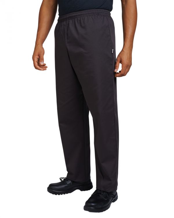 Fully elasticated black chef's trousers. Standard fit, unisex trouser offers incredible value. Hard wearing and easy wash. One hip pocket and tunnelled elastic waist with drawstring. Extremely comfortable for the wearer. 65% polyester 35% cotton. 180gsm.
