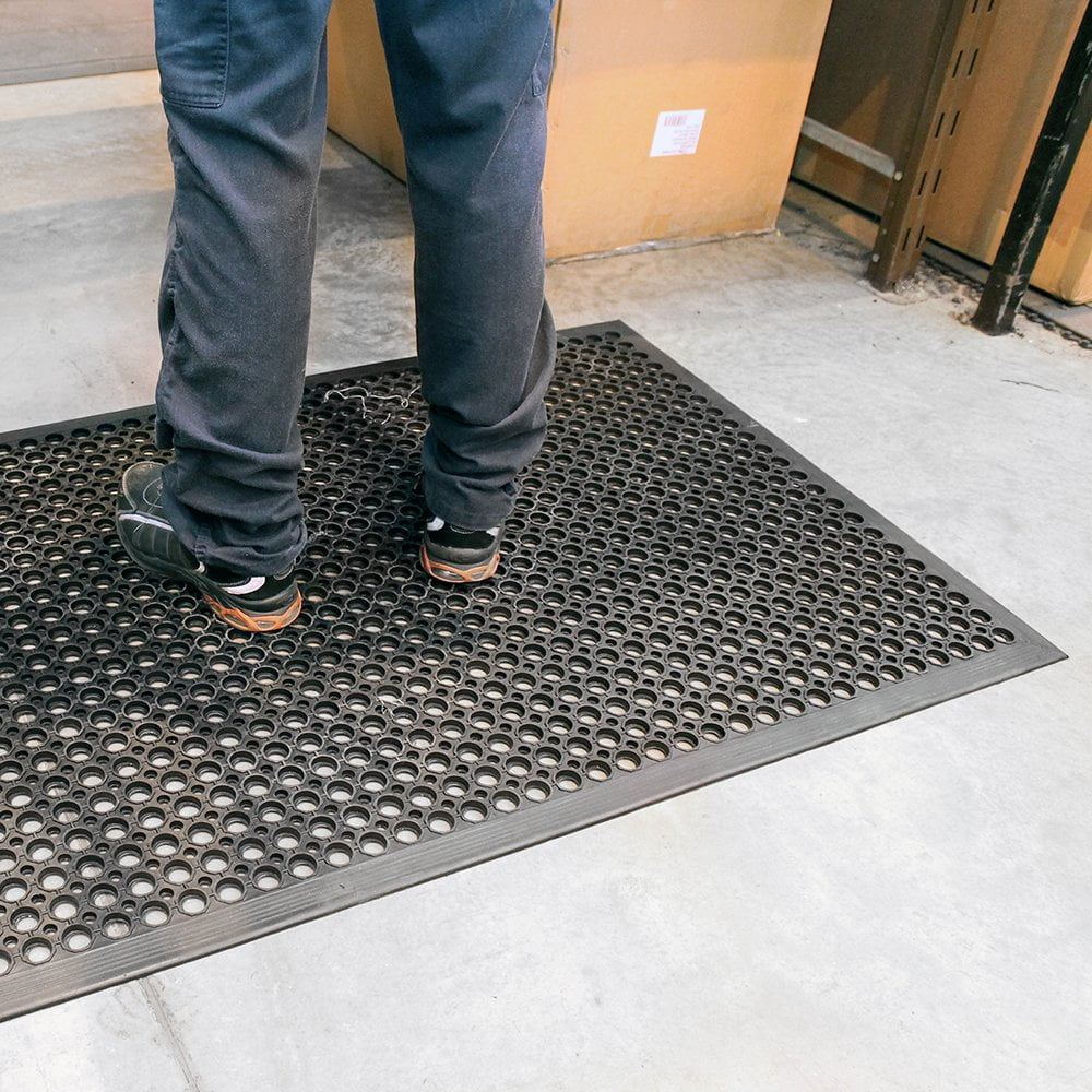 A very comfortable alternative to cold hard floors. Open holes capture spilt liquids and swarf. Manufactured from a blend of rubber for better than average resistance to oil and chemicals. Available in standard mats, edged on all sides, or as interlocking modules for larger areas. Raised circular surface gives excellent underfoot grip. Slip tested to DIN 51130.