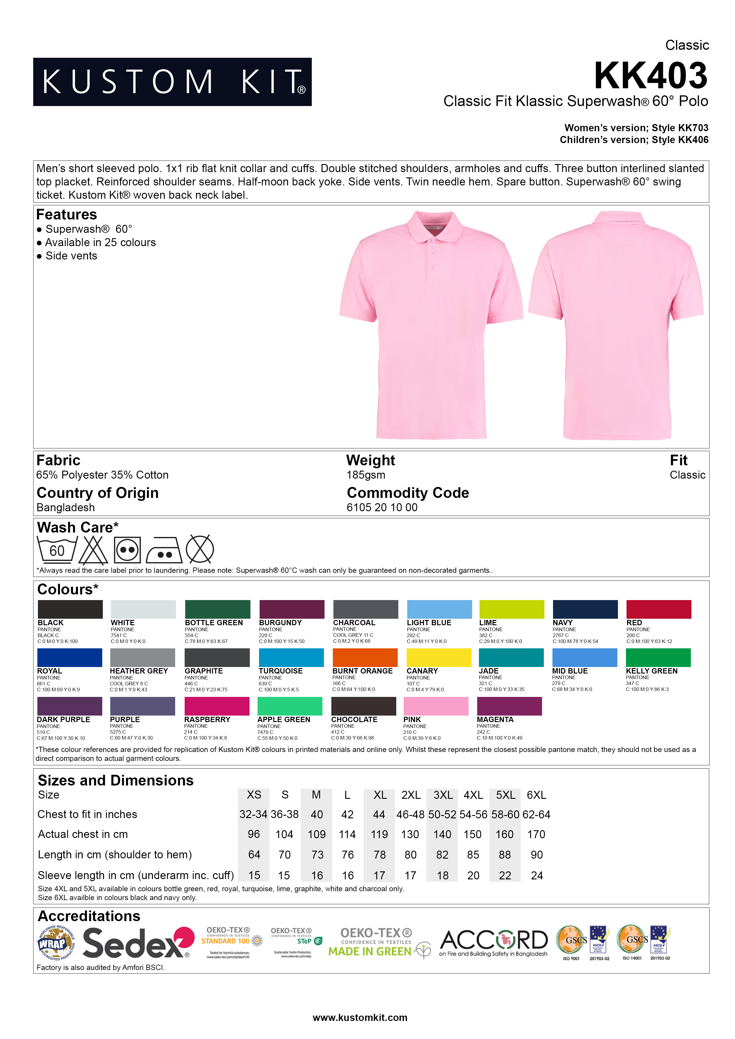Slanted placket. Spare button. Cuffed sleeves. Half moon yoke. Taped back neck. Side vents. Suitable for tumble drying. Taped shoulder seams. Three button placket with slanted top. 1x1 flat knit collar and cuffs.