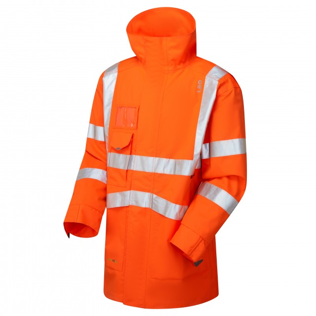 The garment features: Railway Group Standard GO/RT V-Shaped Drop Tail Back (in Orange only), Two Way Main Zip, Full Length Hook & Loop-Fastened Double Storm Flap, Chin Protector, Internal Nelson Pocket, Internal Zipped Patch Pocket, Large Hook & Loop-Fastened Bellowed Front Pockets, I.D Pocket. Fastener: Two Way Interactive Zip. Reflective Tape: 3M Scotchlite.