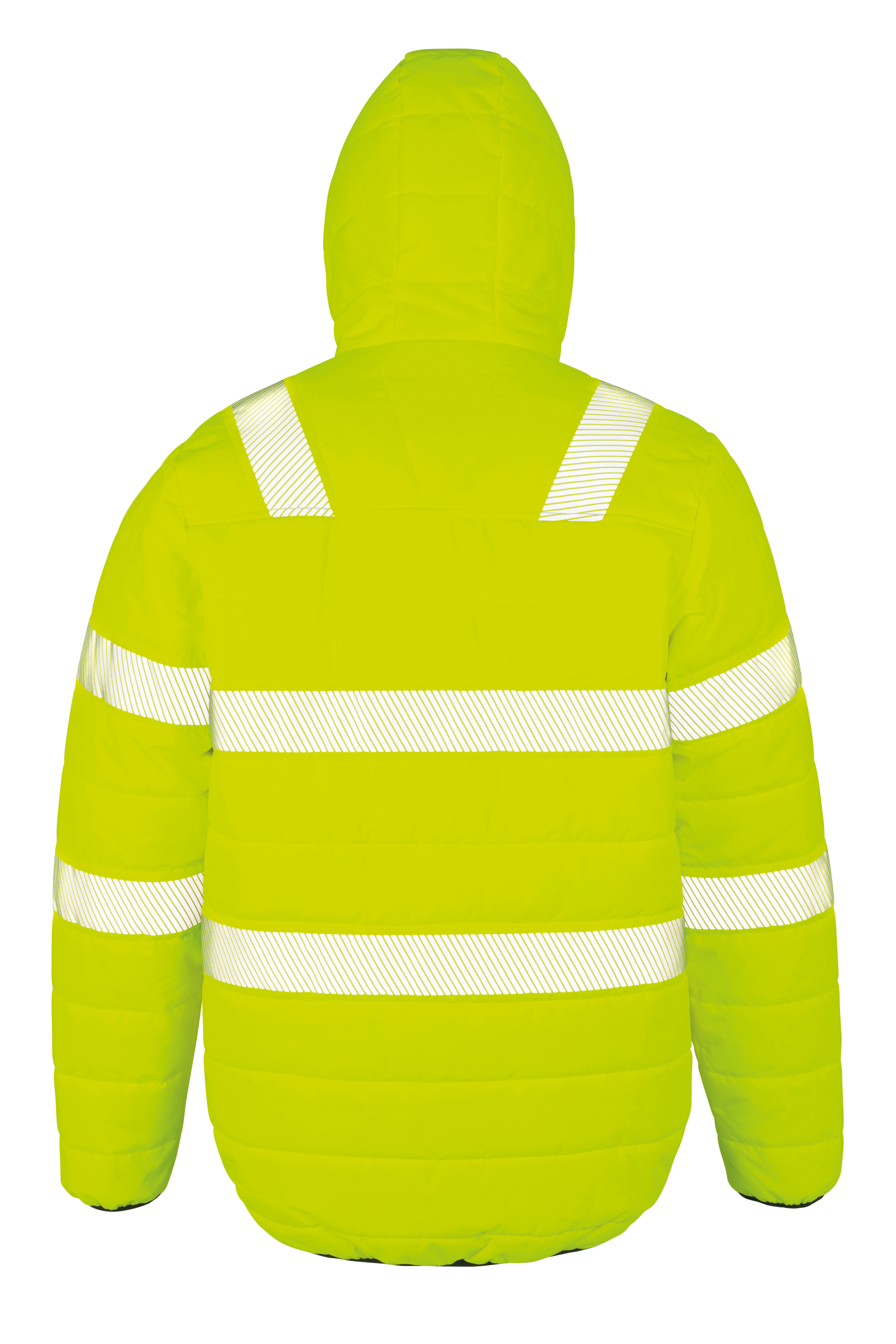 Tough, warm and recycled: a padded printable, hooded safety jacket in water-repellent finish.