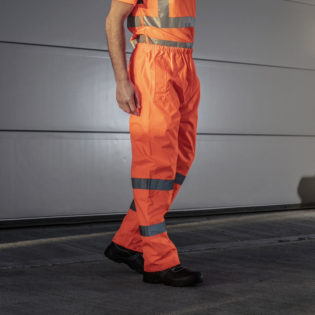 ROKWEAR Hi-Vis Clothing. Durable PU coated over trousers with a 300 Denier Polyester Oxford Weave outer fabric. Pull on elasticated waist. Stud adjustment at leg hem. Side access pockets. Fully taped seams.