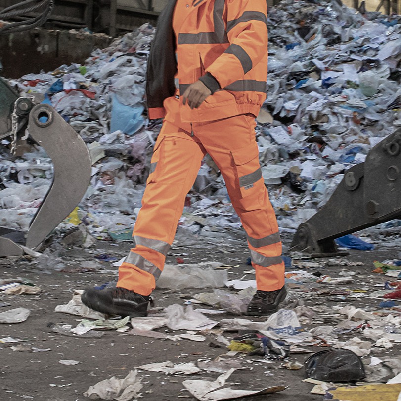 ROKWEAR Hi-Vis Clothing. Hardwearing 280gsm cotton twill fabric. 80% polyester/20% cotton. Water and stain-repellent finish. Slight elastication at sides of waistband for increased wearer comfort. Combat-style leg pockets with reflective piping, plus 2 front & 2 rear pockets. Heavy-duty, nonscratch fixing stud on waistband. YKK brass zip. Triple-stitched main seams. Two Hi-Vis 50mm 3M Scotchlite reflective bands on each leg. Internal knee-pad pockets.