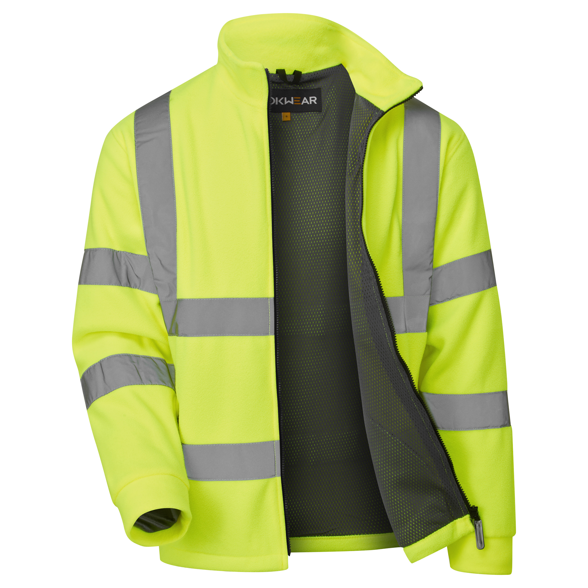 ROKWEAR Hi-Vis Clothing. Versatile, soft, luxurious and warm polar fleece. Grey mesh lining. Full length zip includes collar. Soft cuff design for more wearer comfort. Elasticated hem with side adjusters. Two external pockets with zip closures. 100% Polyester. 300gsm fleece fabric. Sewn on tape.