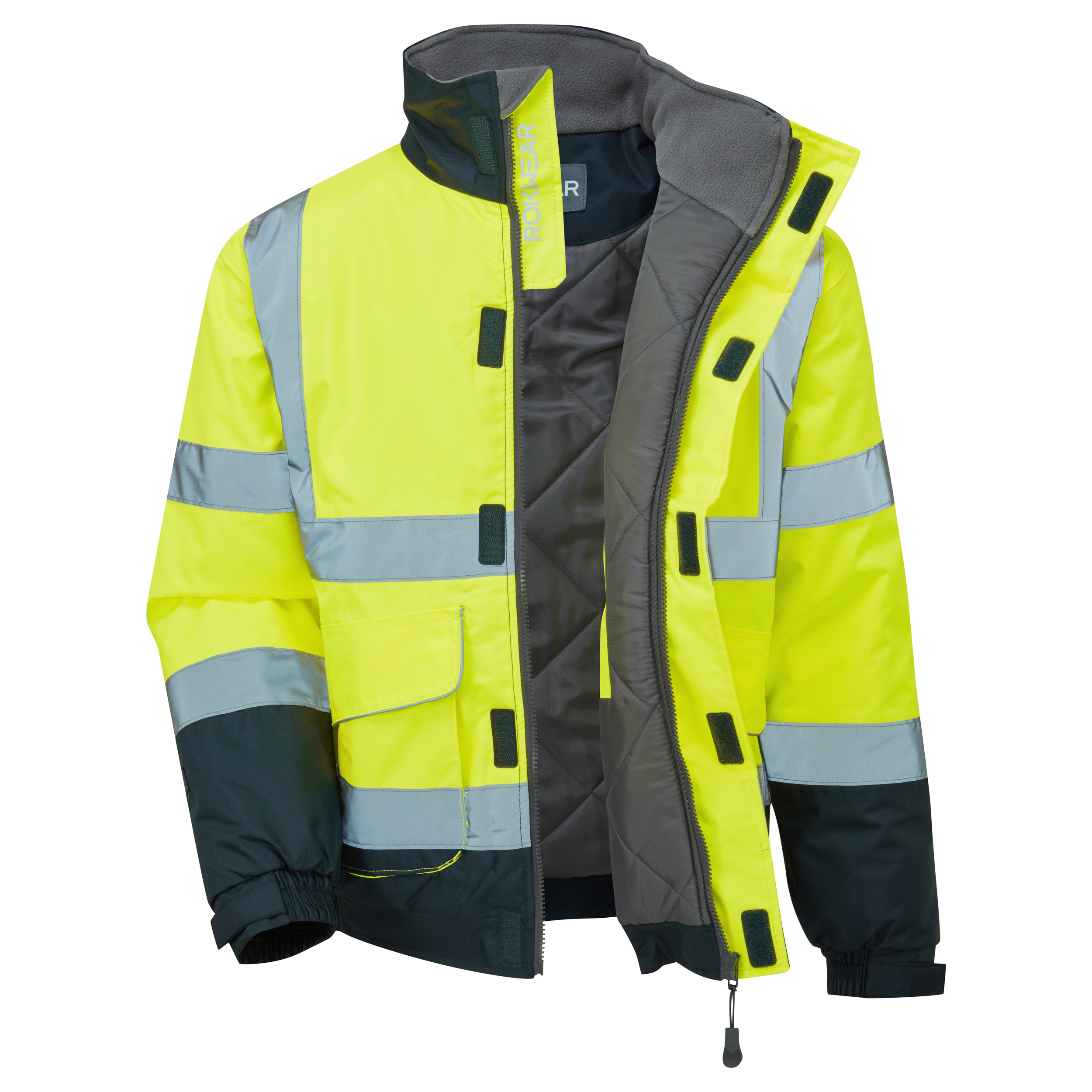 ROKWEAR Hi-Vis Clothing. Durable PU Coated 300D Polyester Oxford Weave Outer Fabric. Storm Flap with Velcro Fastening. Micro-Fleece Lined Collar. Two Lower Bellowed Pockets with Velcro Fastened Flaps with Separate Hand Warmer Pockets. Velcro Fastened Mini Cuff Adjusters. Chunky Zip with Ergonomic Puller. Navy Contrast Panels Across the Shoulders and Lower Body.3824 & 3825.