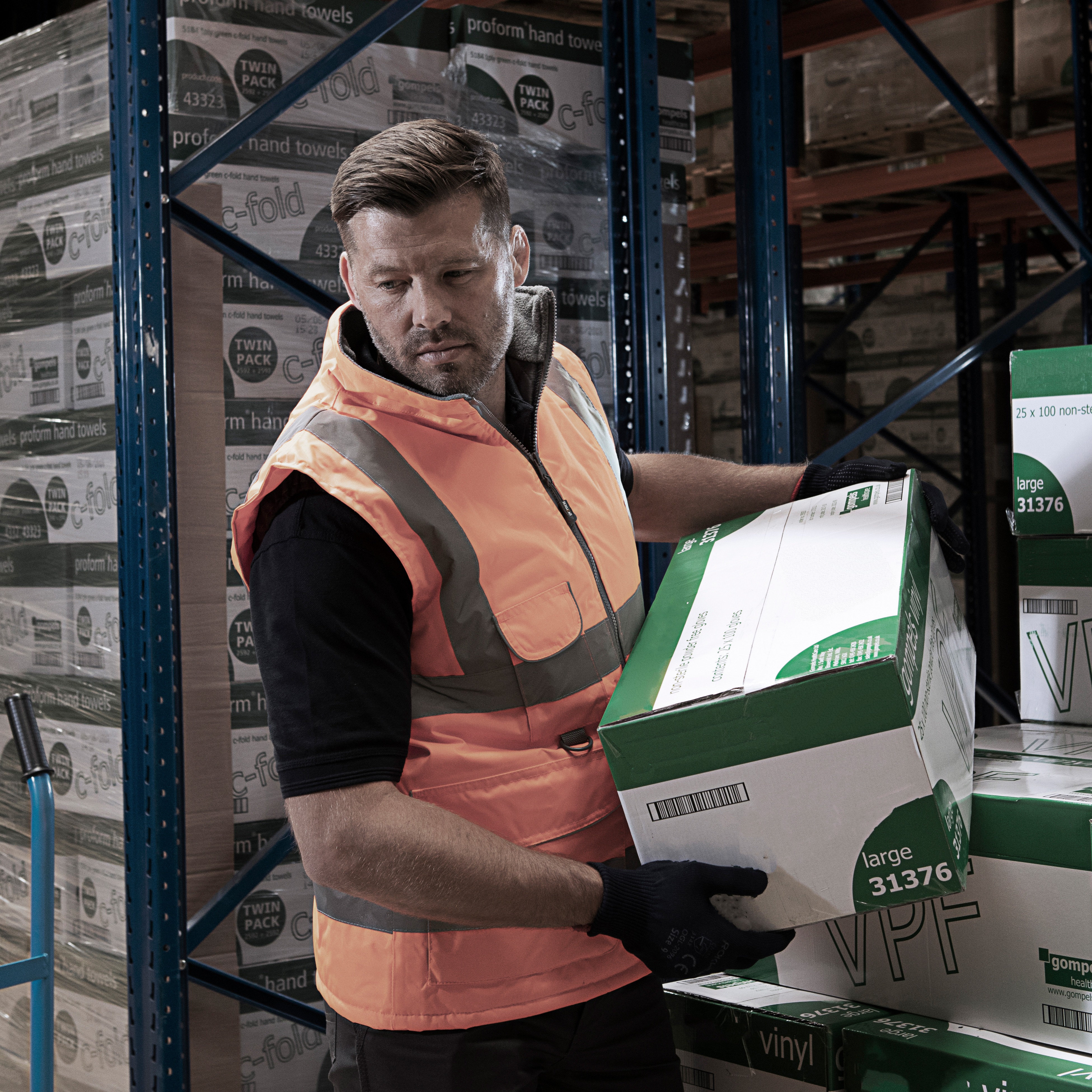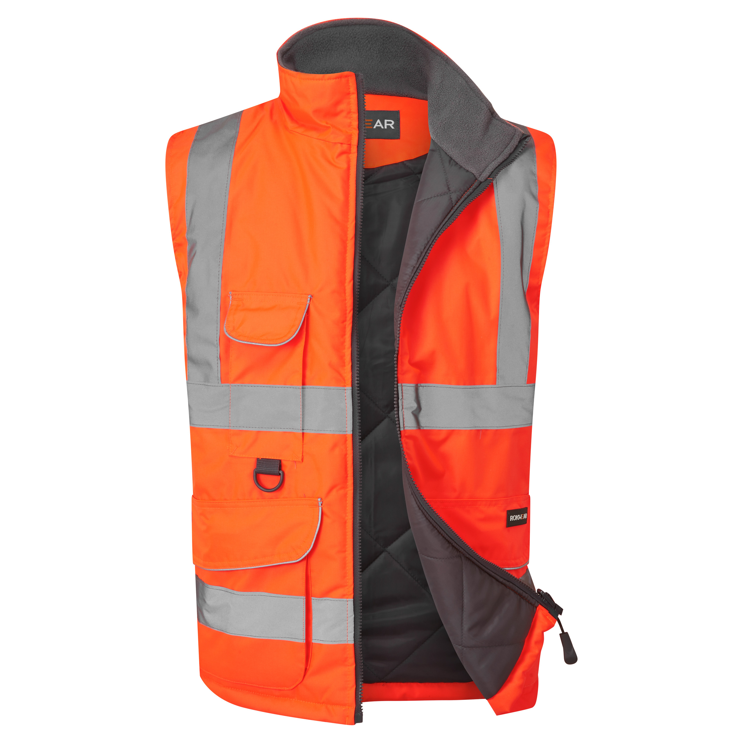 ROKWEAR Hi-Vis Clothing. Durable PU coated 300D Polyester Oxford Weave outer fabric. Fleece lined high stand collar. Elasticated armhole gaitors. Two large lower pockets secured with Velcro fastening. Two brushed tricot lined bellowed side access hand warmer pockets. External phone pocket on right hand breast. Inner chest pocket. Chunky zip with an ergonomic puller. Well-padded diamond quilted lining.