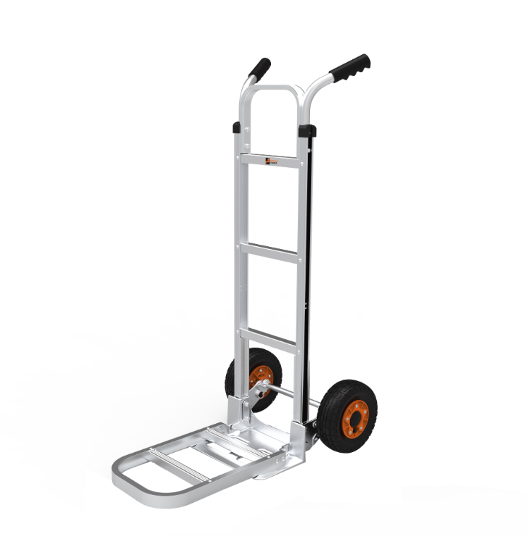 Aluminium frame is lightweight & easily manoeuvrable. 250mm pneumatic, REACH compliant, wheels for use on uneven or rough terrain. Large folding toe plate 457W x 590D